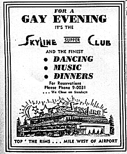 This Skyline Club was located 1 mile west of the airport on the rimrocks above the city of Billings. It was a popular dance venue in the 40s and early 50s and then became a Italian restaurant for a few years. After being reopened in the 60s as a rock and roll club it burned to the ground.