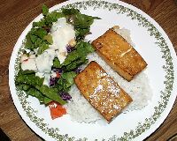 ![]() Slice the tofu. ![]() Place the tofu in the marinade. ![]() Place the marinated tofu on the foil-lined sheet. ![]() The broiled tofu. ![]() Serving suggestion. |