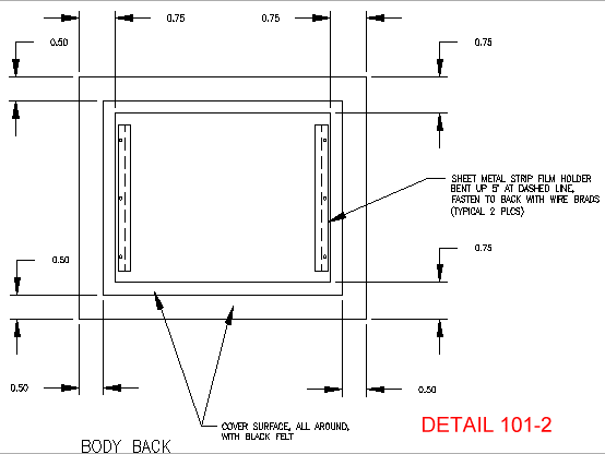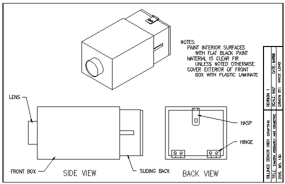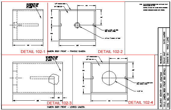 This drawing shows the layout of the camera body front, for both the pinhole and lensed cameras. Only links to the lensed details are included here. See the Camera #2 page for the others. |