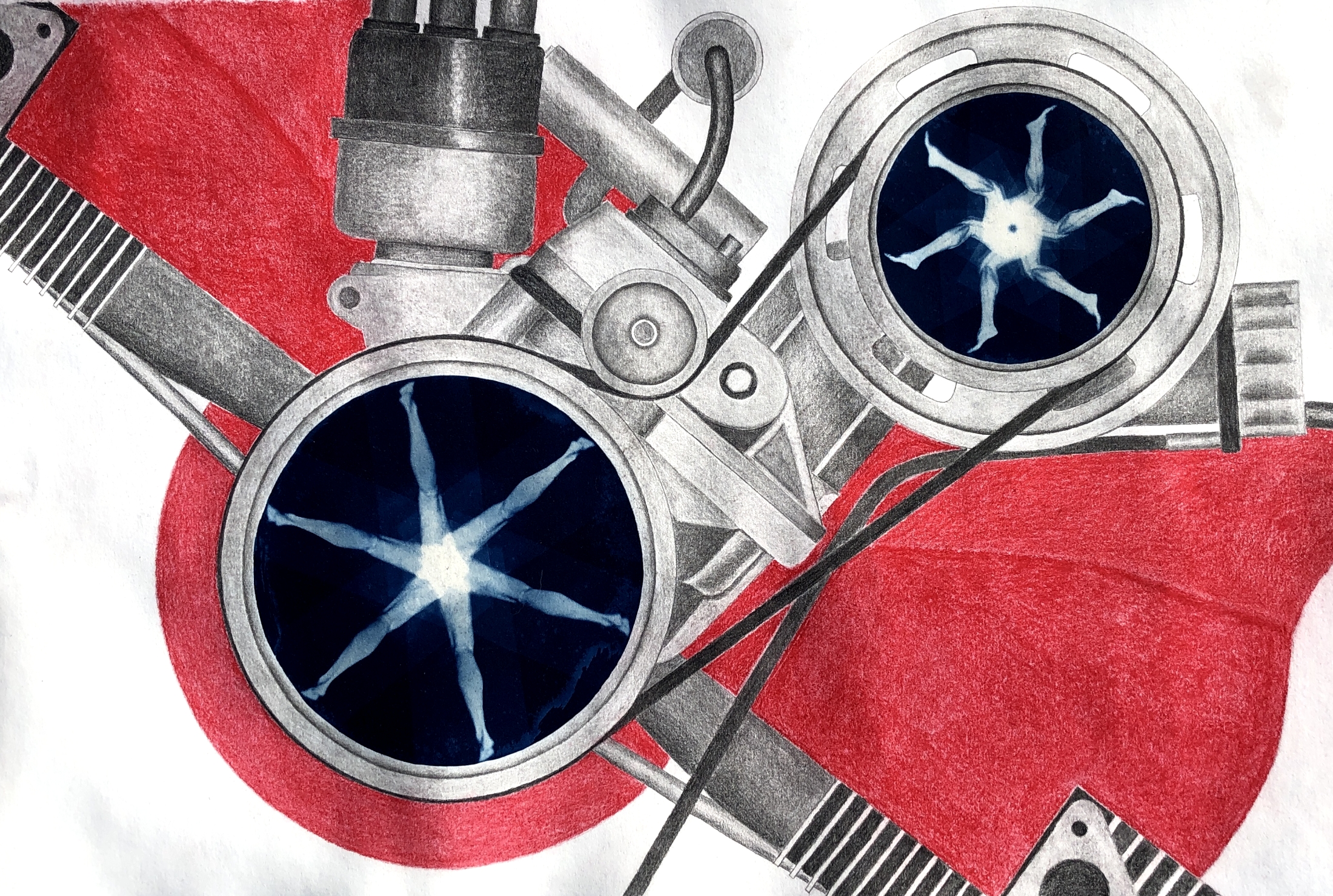 Man and Machine, 2022, cyanotype, graphite, and pastel on paper. 22" x 15". Click on an image to enlarge it. Previous PageNext Page
